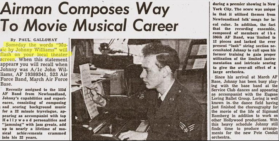 Williams‘ aller første filmkomponist-oppdrag var til en 20 minutters turist-reklamefilm – You Are Welcome (1954) – for Newfoundland-rådet der han var stasjonert under militærtjenesten. Det avstedkom denne artikkelen i «The Beacon» (en nyhetsbulletin for det amerikanske luftforsvaret) i august 1954, med en ganske profetisk innledning: